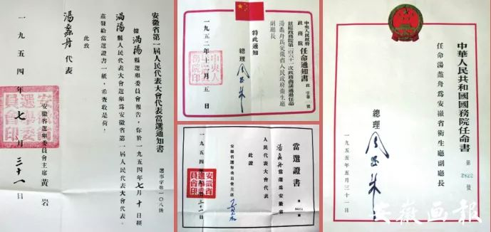 1952年、1955年由周恩来总理签发给汤蠡舟的国务院任命书和1954年由黄岩主席签发给汤蠡舟的安徽省人民代表大会代表当选证书