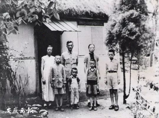 上世纪40年代,抗日战争胜利前,汤蠡舟(左三)和夫人许雅南(右二)与孩子们在贵州贵阳图云关山上的留影,照片背面写有:一群瘦人