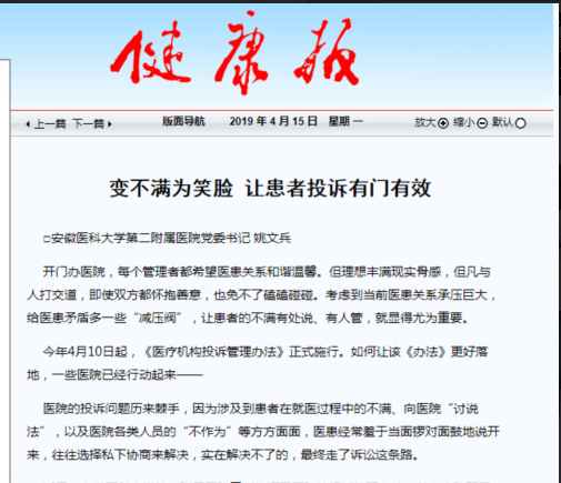 总体来说,医疗机构要正确对待患者投诉。规范医院的投诉管理,实际上也是希望所有医护人员能够尽职尽责,勇于担当,避免不必要的差错。医疗行业执业风险本身就很大,在遇到纠纷时,只要双方能够真诚面对,相互理解,医患和谐就是可期的愿景。(本报记者 颜理海 整理)