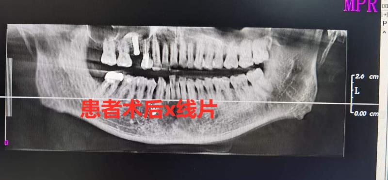 术后拍摄的口腔全景片显示,种植体周围的骨质宽度及高度合乎理想,手术圆满完成。