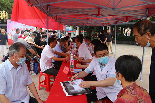 义诊当天,医务人员们早早来到鼓楼广场,他们仔细地了解患者病情,结合病史制定详细的诊疗方案,并耐心细致地解答他们咨询的健康问题,从饮食、运动、用药等方面给予合理化建议。今年72岁的张大爷是位糖尿病的“老病号”,听说有安医的专家来义诊,他便慕名而来。张大爷现场测了血糖,内分泌科主任医师余本富根据他近期的身体状况及用药情况,为其调整了用药方案。临走时,余本富反复叮嘱大爷要按时服药,健康饮食,合理锻炼,定期到医院复查。