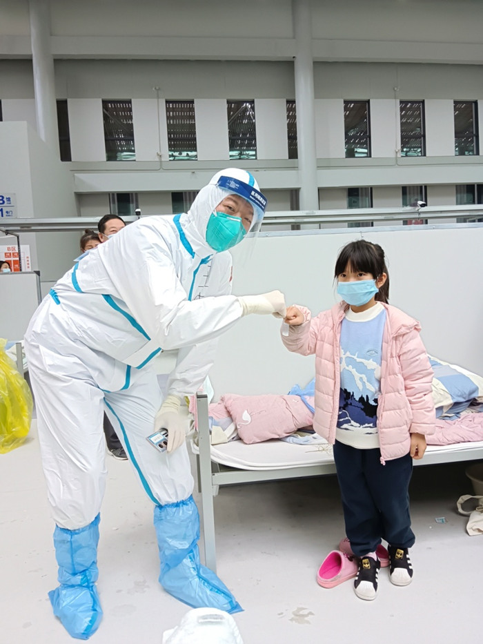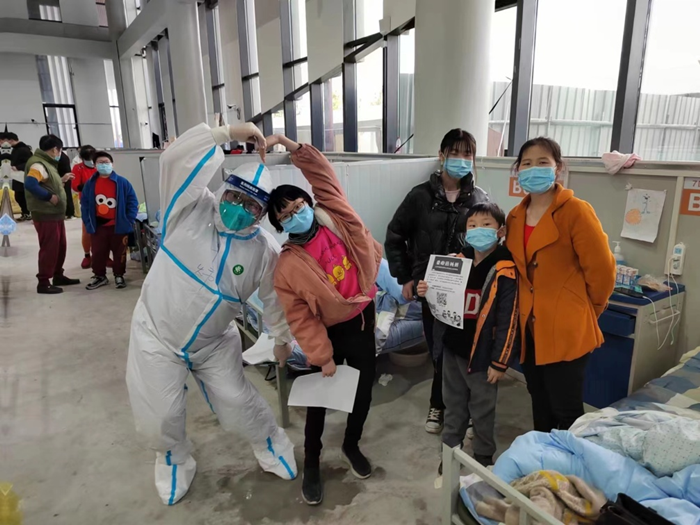 方舱里的患者一批进一批出,其中也有一些小朋友患者。初步统计,从8岁到16岁的孩子大约有20位,孩子们虽然有家人陪同,但队员们都非常关注他们的学习情况。一开始巡视舱位的时候,会叮嘱他们要少玩手机多学习,后来为了给孩子们在舱内尽可能的创造更好的学习环境,我们搬来一些桌椅充当临时课桌椅,还设立了“爱心小超市”,孩子们可以用完成的作业或者创作的作品来兑换小零食。