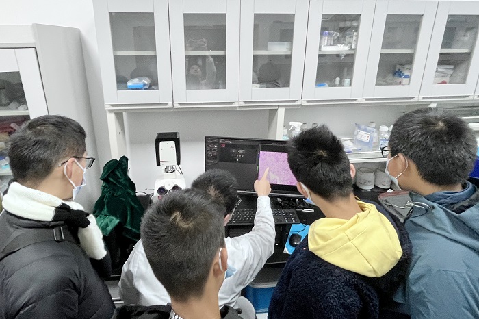 活动中,该所研究生志愿者为中学生们现场分发了事先制作好的科普彩页,并结合图文生动形象地讲解了实验动物、细胞和细菌等实验知识,过程中还设置随机问答环节,并准备小奖品。中学生们积极抢答,展现了对科学实验学习和研究的浓厚兴趣。参观实验室时,研究生们详细介绍了正置荧光显微镜等实验常用的仪器及操作,讲解了实验安全注意事项,并进行超净台的操作演示,以及小鼠的肾组织切片的显微操作、基因鉴定的配制等内容。同学们纷纷表示感受到了科学的魅力,收获颇多。