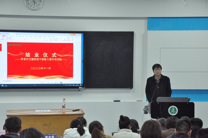 11月26日下午,由我校继续教育管理办公室和卫生管理学院联合举办的界首市卫健系统干部能力提升培训班顺利结业。继续教育管理办公室主任黄升海、界首市卫健委党组书记郭启峰出席。界首市卫健委党组成员、城市计划生育管理中心主任刘志永主持结业仪式。