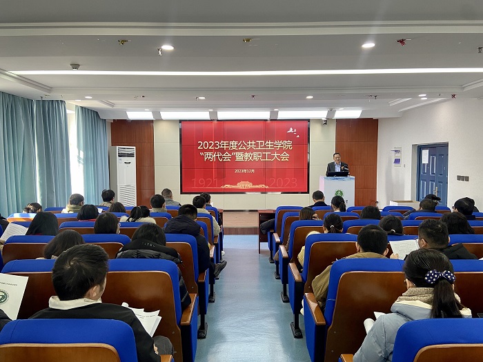 12月25日,公共卫生学院召开2023年度“两代会”暨教职工大会,该院党委书记马军成主持会议,执行院长王华作2023年度学院工作报告。
