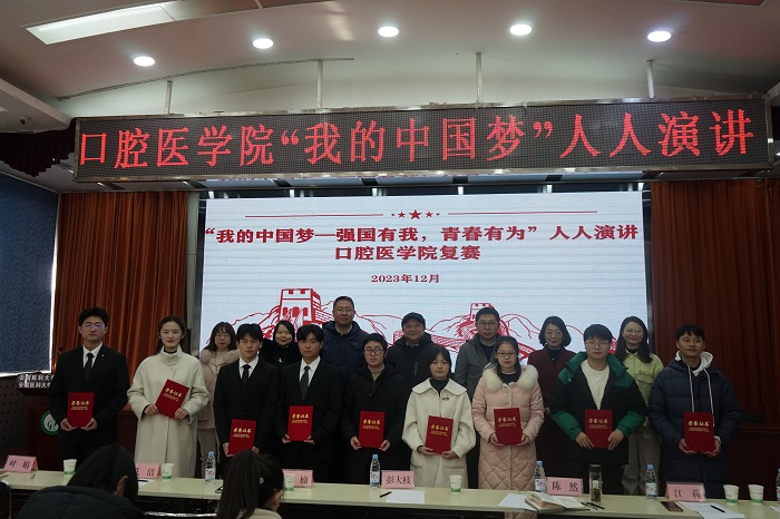 2023年12月25日,口腔医学院举办“我的中国梦——强国有我,青春有为”人人演讲院级复赛。校党委学工部部长秦楠、校关工委委员彭大枝、该院党委副书记陈然以及思政理论课指导教师受邀担任评委。