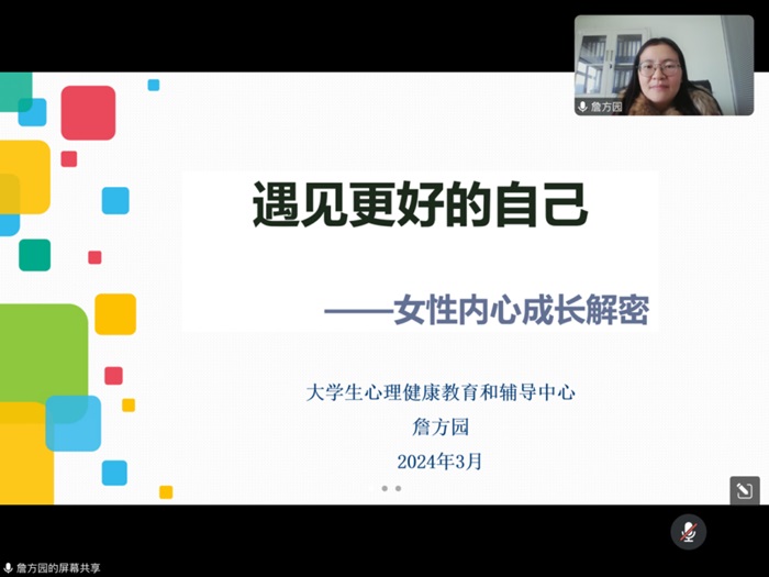 中心还邀请大学生心理健康和辅导中心教师詹方园,开展题为《遇见更好的自己——女性内心成长解密》在线讲座。讲座内容丰富、实用性强,围绕女性心理健康的重要性和有效沟通途径等话题展开讨论,赋能全校女职工,帮助她们以更加积极饱满的态度应对新学期各项工作。