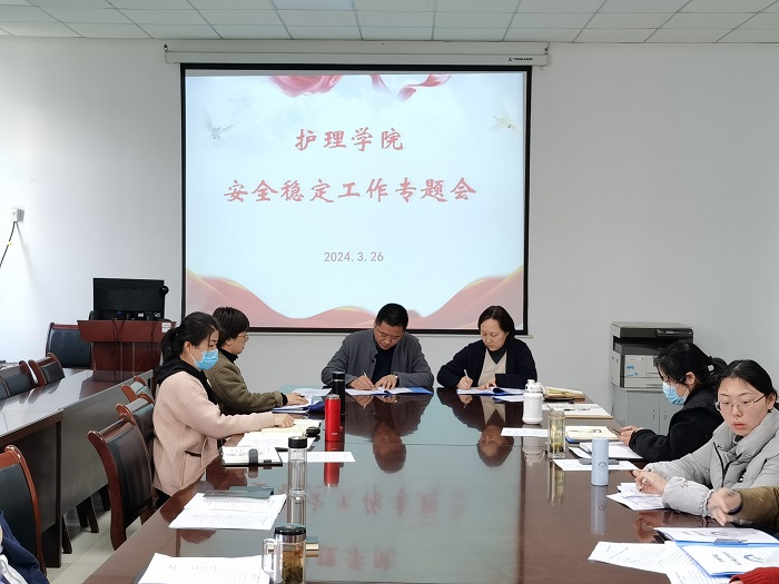 3月26日下午,护理学院召开安全稳定工作专题会,传达了学校安全稳定工作会议精神,集中学习维护校园安全稳定工作及校园安全文化节活动方案等相关文件。该院党委书记薛磊出席会议并与学院各职能部门、教研室(中心)负责人、辅导员代表签订了《安全稳定责任书》,院党委副书记王磊、副院长赵梅出席会议。